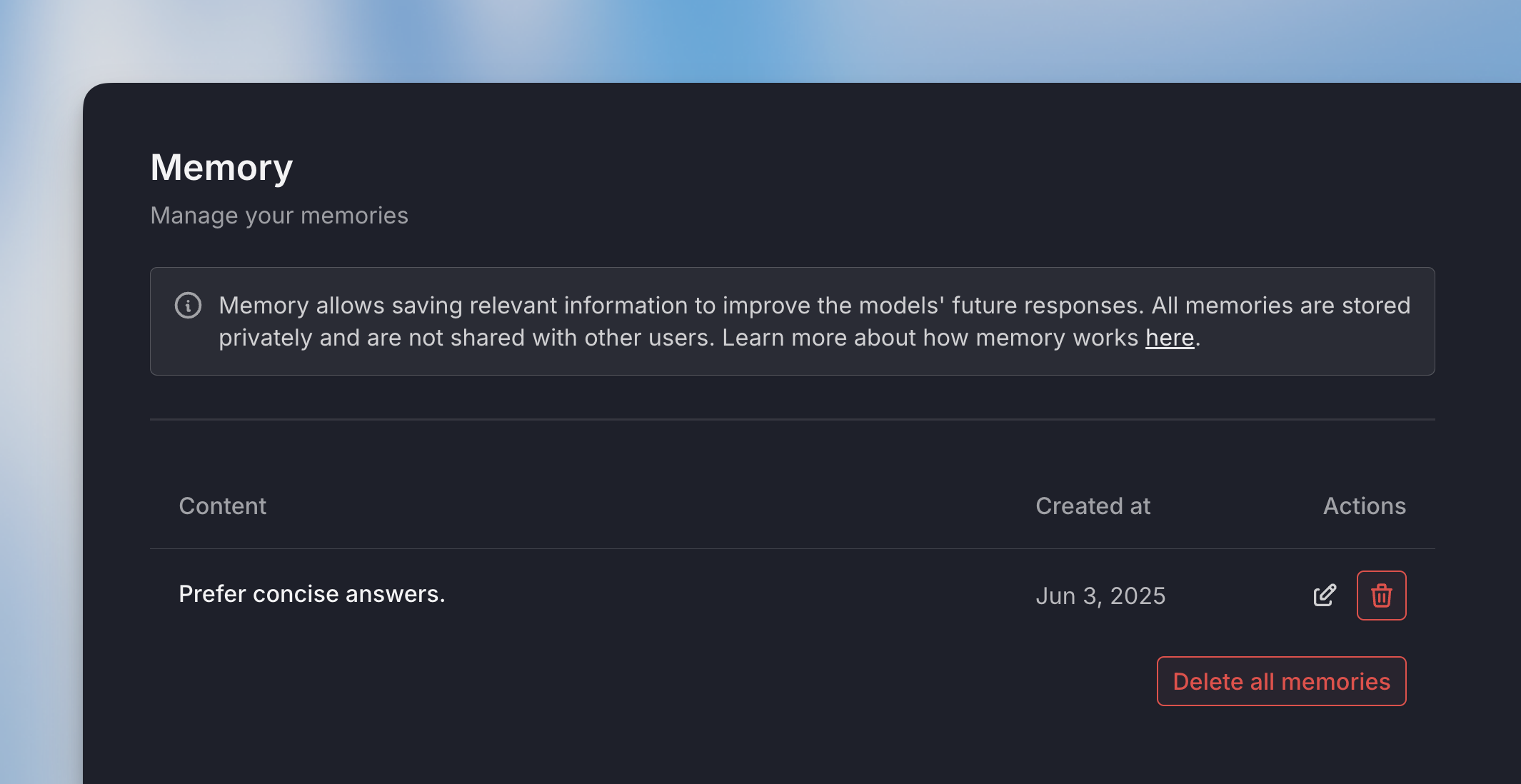 You can view and manage all your memories by going to the “Memory” tab in your account settings. There you’ll also find an edit option if you want to adjust the wording without having to go through the memory creation process again.