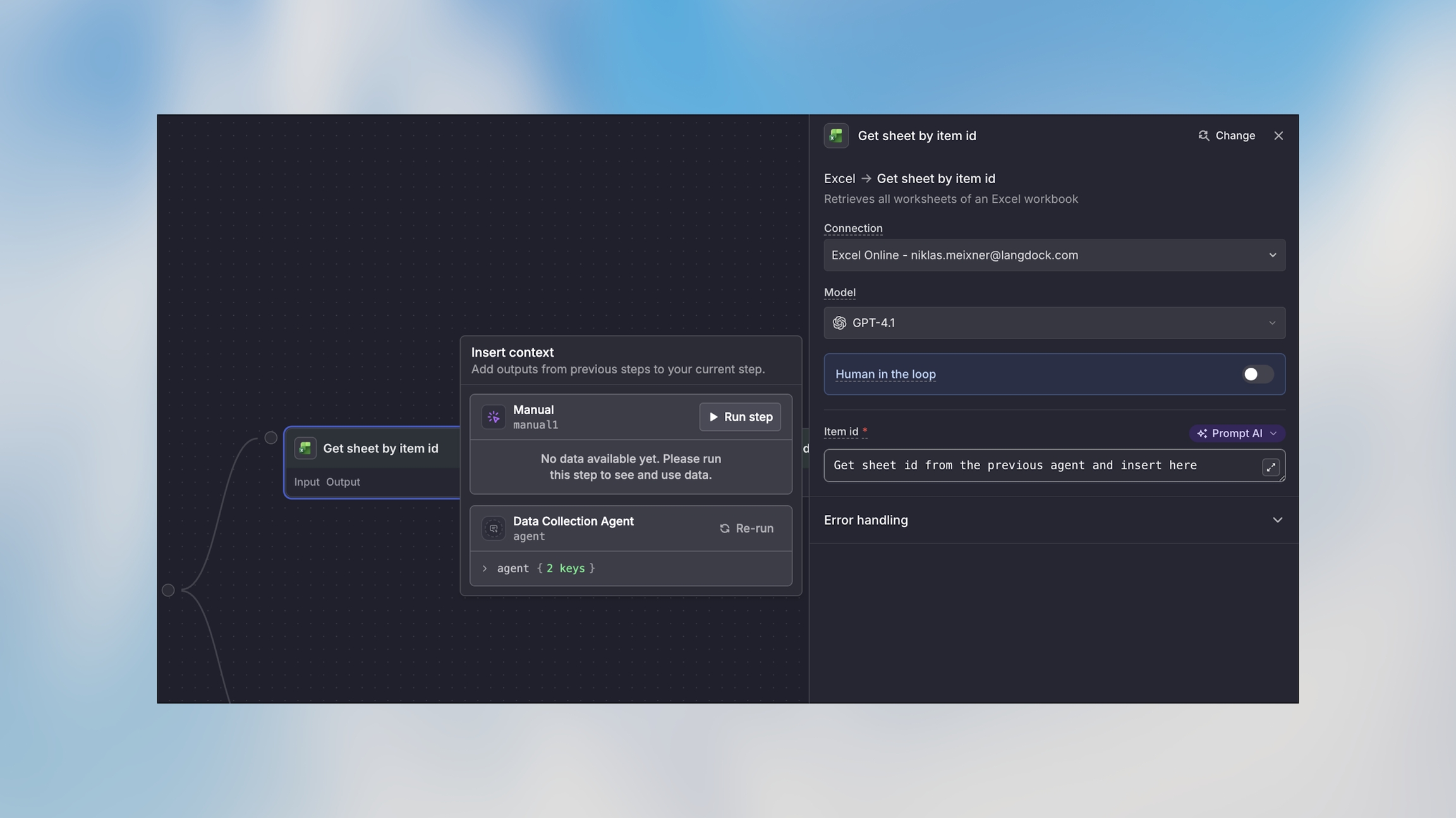 Elke node in je workflow heeft velden die geconfigureerd moeten worden—ontvanger-e-mailadressen, berichtinhoud, API-parameters of te verwerken gegevens. Langdock biedt drie intelligente manieren om deze velden in te vullen, elk geoptimaliseerd voor verschillende scenario's.